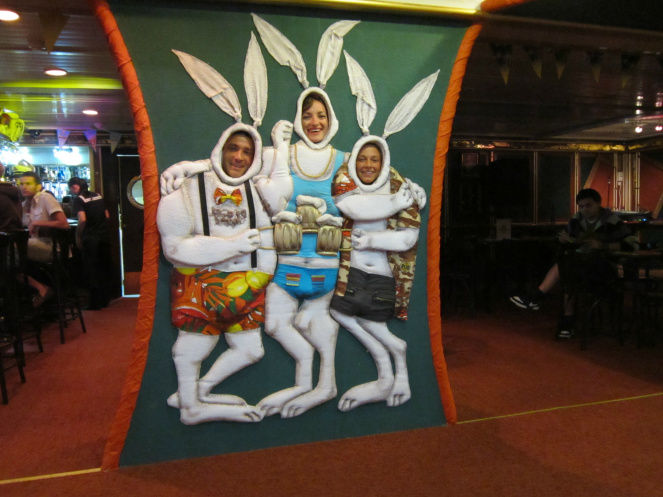 Вот у нас уже полон стол напитков и закусок в виде орешков и шоколада, а есть-то хочется. Поблуждав по парому, остановились на маленьком кафе с незамысловатыми блюдами в среднем за 5 евриков. И в течение почти всей поездки для нас были коронными яствами мега-бутерброд с креветками и отменная солянка этого кафе, которая выручала нас особенно по утрам. Но не подумайте, что все так скромно, разгуляться на пароме, оказалось, есть где, на все вкусы: и спорт-бар с вечерней живой музыкой и ночным караоке, и бар Коламбус с зажигательной шоу-программой, и ресторан А Ля Карт, и ресторан Семь Морей с шикарным шведским столом с звездой программы – нежнейшей красной рыбой в различных вариациях, немного сомнительной красной, и даже черной! икрой, а также креветками и мидиями, и конечно же, вином без ограничения :) Правда, шведским столом мы воспользовались лишь в последний вечер, экономия должна быть экономной, а сие удовольствие стоило около 30 Евро, если не ошибаюсь. Хотя было очень вкусно, и объелись мы, что животики чуть не лопнули, и игристое вино на вэлком тоже было в плюс.