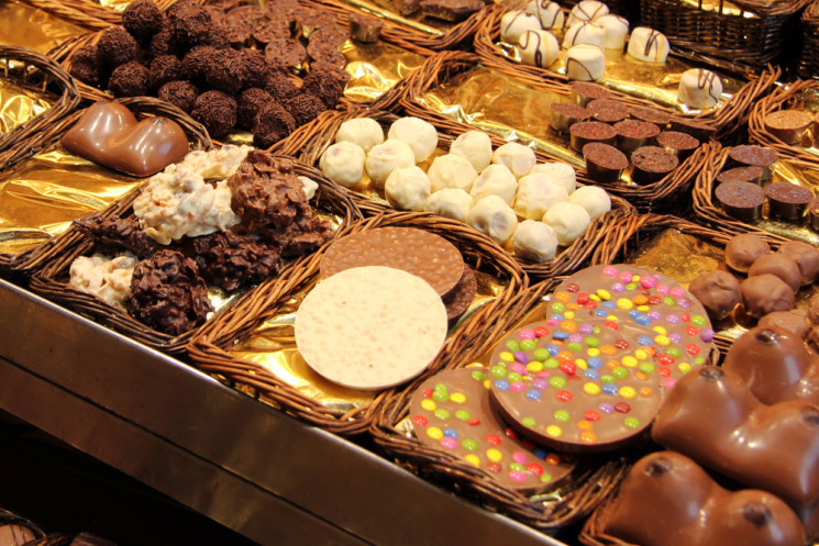 Поэтому вышли на бульвар Рамбла - самую знаменитую пешеходную улицу длинной 1 км. Место многолюдное. На бульваре оказались в районе Дома Бруно Куадрос Casa Bruno Quadros с зонтиками и драконами на фасаде. Тут заглянули на рынок Бокерия (поели фруктов, выпили смузи за 1,5 евро) с огромным выбором гастрономических изысков.