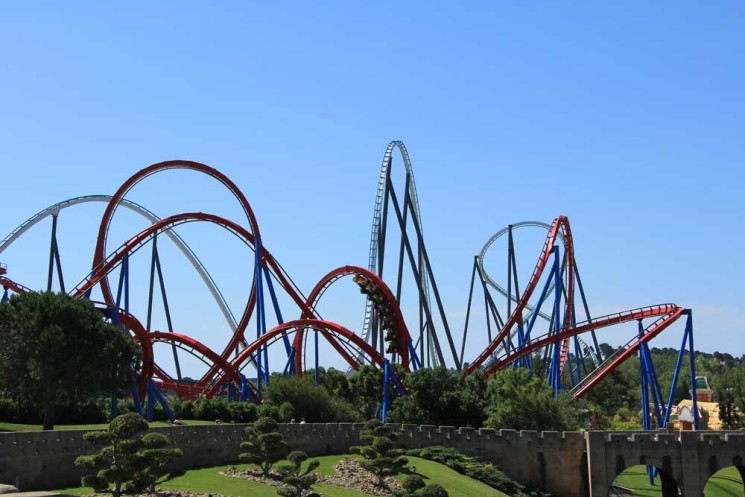 В парке множество тематических зон: Средиземноморье (Mediterrania, тут находится аттракцион Фуриус Бако (Furius Baco) - катапульта, которая летит горизонтально и набирает скорость от 0 до 135 км/ч за три секунды), Полинезия (Polynesia, мне запомнились шоу в данной области, наиболее интересный аттракцион данной области сплеск Тутуки (Tutuki Splash)), Китай (China, тут самые высокие горки в Европе "Шамбала" - падение с 76 метров. Также здесь аттракцион Дракона Хана (Dragon Khan) - 8 мертвых петель и скоростью в 110 км/ч), Мексика (México , падение с гигантской 100-метровой высоты вниз на аттракционе Ураган Кондор (Hurakan Condor), настоящее свободное падение), Дикий Запад (Far West, американский колорит, настоящий Дикий Запад), СезамоАвентура (детская зона).