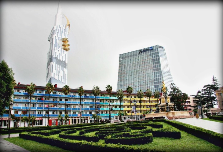В субботу мы выезжаем в Батуми. Дорога занимает около 4 – 5 часов. Все это время я ехала можно сказать, с открытым ртом. Красота неописуемая! Путь проходит около живописных гор и быстрых речек. Грузия божественна. Приехали в Батуми уже под вечер. Он горит, мерцает и переливается яркими огнями. Подсвечена каждая пальма. Батуми очень дорогой курорт, очень большие деньги правительство страны вкладывает в его развитие. Вы когда-нибудь видели ресторан, построенный вверх ногами??? А университет напоминающий небоскреб с колесом обозрения?? И я не видела. Поражают воображения все эти причудливых скульптуры и статуи. К примеру, на побережье стоит 6-метровая движущая скульптура Али и Нино. Оооой, это вообще самое романтическое место Батуми на мой взгляд. Очень красиво! Это обязательное место для посещения, особенно если вы влюбленная пара! Скульптура доказывает, что даже если ваши дороги расходятся, в конечном итоге, если вы созданы друг для друга, вы снова встретитесь, не важно через какой промежуток времени!
