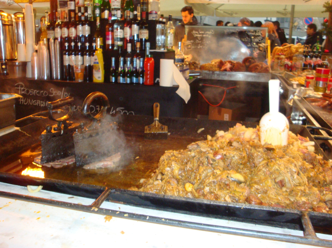 Конечно, световой день в январе короткий, но зато вечером видно красивую подсветку на мостах, Парламенте, королевском дворце и т.д. И к Рождеству город очень нарядно украшен, много базарчиков в пешеходных местах: там жарят всякие колбаски и продают горячее вино и чай-кофе. На одном лотке увидела, что в качестве пресса на кусках жарящегося мяса стояли старинные утюги — забавно.