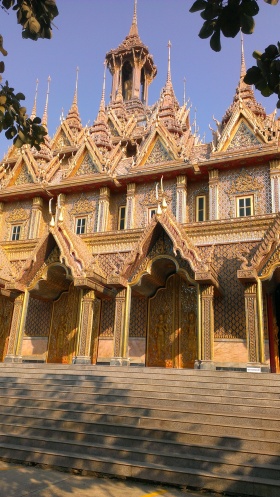 Следующим был зеркальный храм. По приданию считается, что именно в нем некоторое время прибывал в роли ученика Рама 9 перед тем, как стать королем. В нем же находится тело монаха, который достиг нирваны также, как Будда. Храм получил такое название, так как его фасад и внутренне убранство полностью состоит из зеркальной мозайки. Однако несмотря на свою роскошь, он не оставляет то впечатление, как другие. Сюда приходят тайцы и оставляют подношения монаху, тело которого покоится на богато украшенном пьедестале. Тут же они делают совместную фотографию, а кто-то из посетителей играет с детьми.. Поэтому временами кажется, что люди забывают куда они приходят и для чего.
