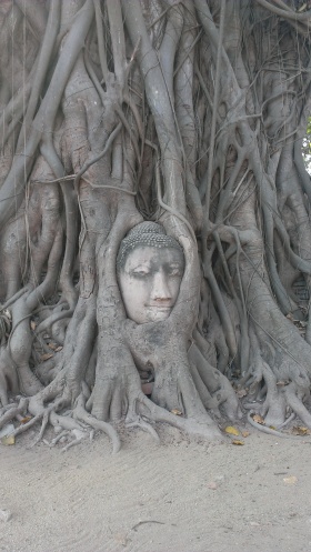 Бирманцы, совершающие постоянные набеги на Тайланд, разрушали храмы, а вместе с ними - статуи Будды, отсекая им головы и руки. По легенде, эта голова была закопана в землю, но спустя столетие, вышла на поверхность вместе с корнями дерева.