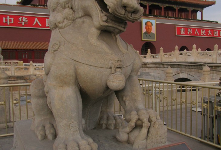 Выйдя из метро нас встретили огромнейшие ворота Небесного Спокойствия, которые являются центральным входом в Запретный город с портретом Мао Цзэдуна. Слева и справа от входов в город расположены знамениты каменные львы, которые охраняют императорский путь, около них стоят мраморные колонный Хуабяо (Huabiao) на них вырезаны узоры драконов.