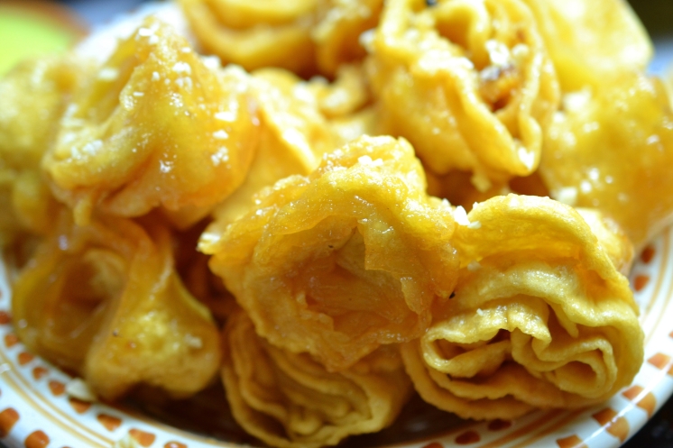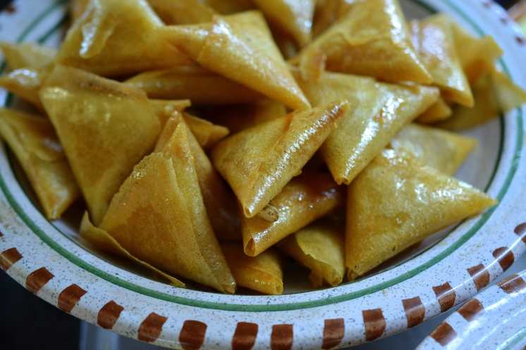 А это блюдо готовили в Тунисский вечер:в тонкий пласт рисового теста вбивают сырое яйцо и кладут поре из картофеля и овощей,жаря в кипящем масле эту своеобразную "юбочку".