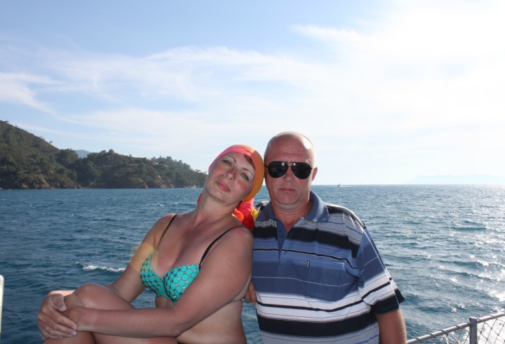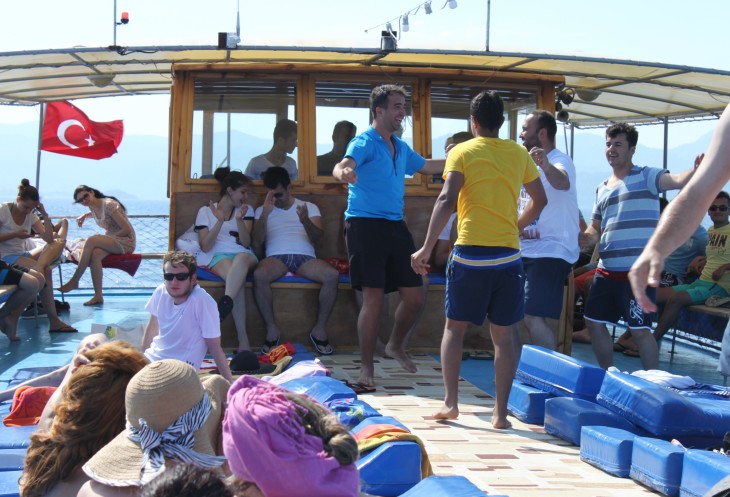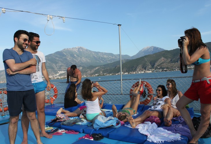 Мне даже стало любопытно: что это за коллективный выпоз такой? Я примостилась возле группы турчанок, которые оживленно между собой беседовали. Приняли они меня очень дружелюбно, но в разговор с ними я не вступала, у них своя компания. Пыталась уловить смысл разговора, но поняла только то, что они обсуждают какой-то маршрут, и ещё они много говорили про Олюдениз, параглайдинг и рафтинг. Ну, это я стержень разговора поняла, а подробности для меня остались недоступными. Девушки совсем не выглядят по мусульмански скромными: купальники-бикини, очень ухоженные, маникюры-педикюры, обесцвеченные волосы, тонкие сигаретки, пивко… Явный «закос» под европеек! Потом одна девушка пошла на нижнюю палубу, оставшиеся начали про неё что-то спорить, на разные лады выговаривая её имя. Так я поняла, что они между собой мало знакомы.