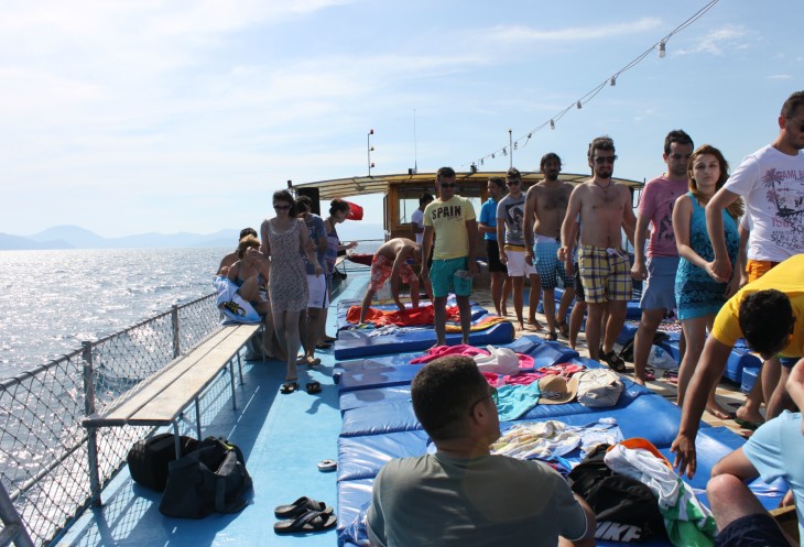 Муж остался на нижней палубе в тени, я отправилась наверх, на солнцепёк. По всей палубе были раскиданы матрасы, практически все они были заняты молодыми турками обоего пола.