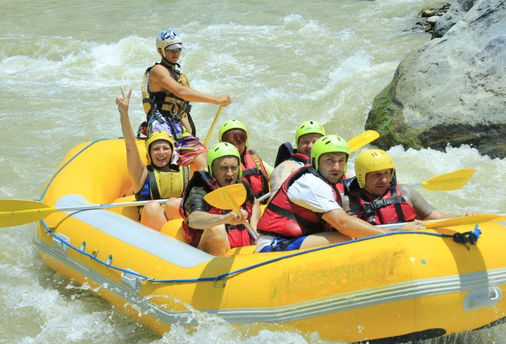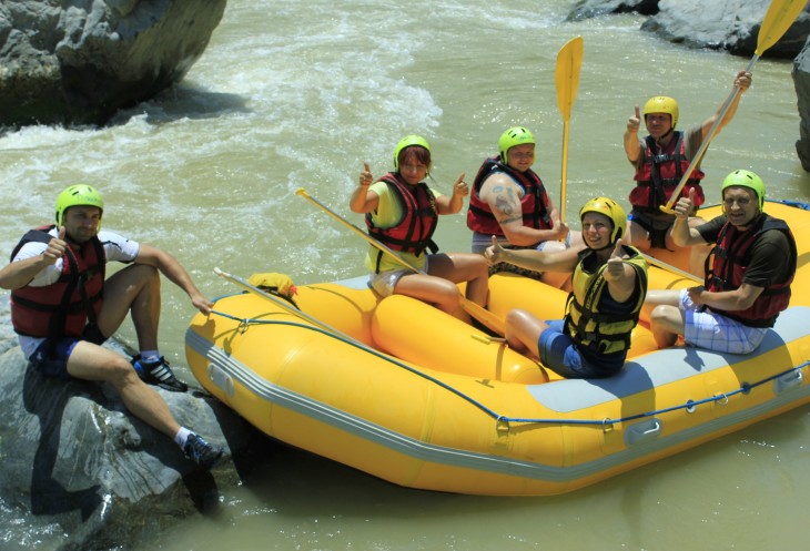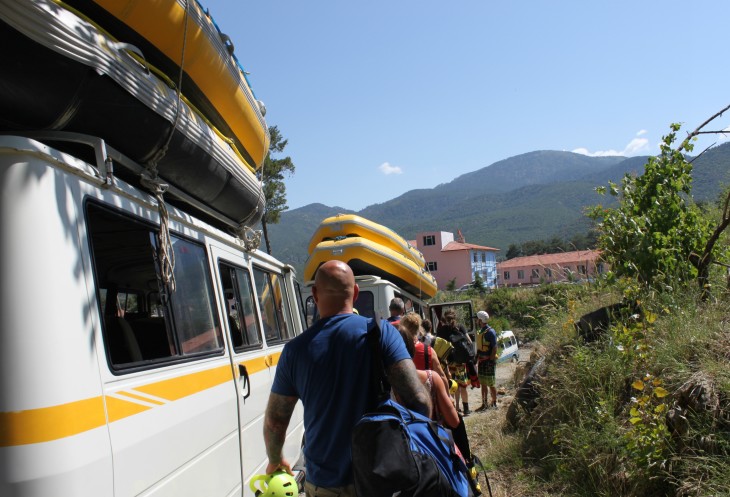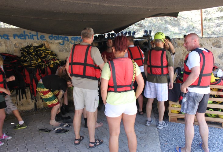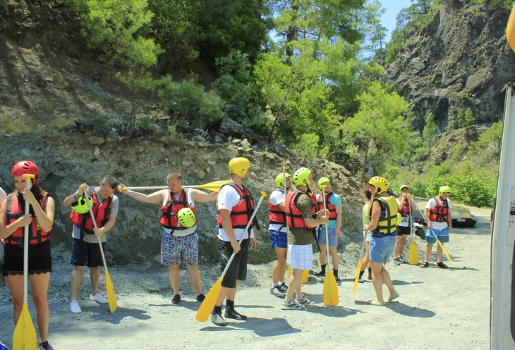 Среди «рафтингистов» я услышала родную речь, и сразу предложила держаться вместе. Разговорились. На рафтинг прибыли двое москвичей. Михаил и Сергей. Жёны с детками остались в отеле («Летуния» в Олюденизе), мужья решили испытать немного речного экстрима. Хотя, после вчерашнего параглайдинга, им пришлось впечатления успокаивать немалым количеством спиртного: что-то там шло не так, и со смотровой площадки их чуть ли не пинками скидывали! Н-дя уж, а ведь я могла там быть именно ВЧЕРА!!!!