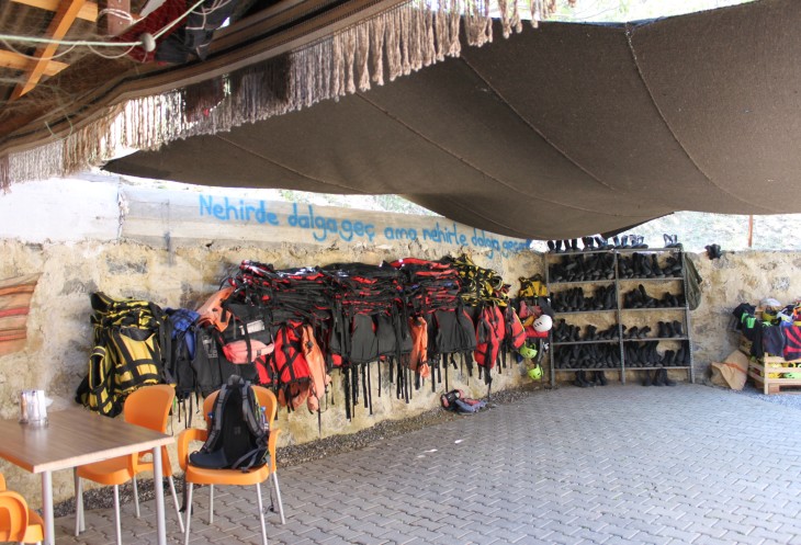 Ну, вот и пришло время облачаться в спасжилеты, шлемы и специальную обувку. Спецобувь можно было приобрести на прокат за 5 то ли лир, то ли долларов. Не помню. У кого была подобающая для рафтинга обувь, могли сплавляться в своей. У меня были с собой аквашузы, ребята-москвичи были в кроссовках.