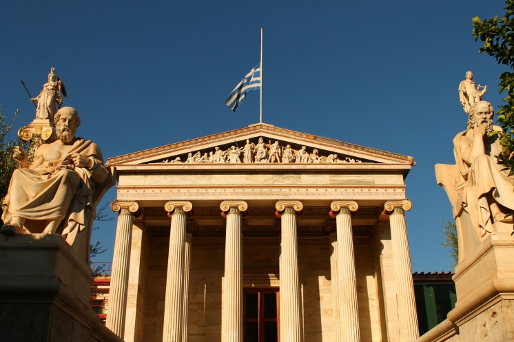 Мне же больше всего понравилось здание Академии, украшенное фризами и статуями Аполлона и Афины на колоннах. Известно, что возвели его благодаря щедрым пожертвованиям семейства барона Симона Синаса, который был послом Греции в Вене, Берлине и Цюрихе.