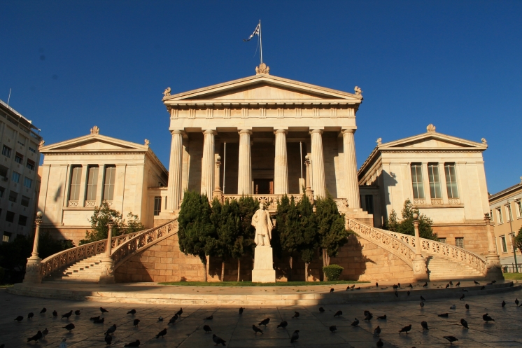 Площадь впечатлила. Место красивое. Читая про Афины - я думала, что эти здания стоят по переметру привычной квадратной площади. Но нет - они вытянуты вдоль улицы, чуть в глубине от нее, образуя длинную, но узкую площадь, примыкющую к улице. Центральное место занимает здание Университета, сллева от него - здание Национальной Библиотеки, а справа - Академия Афин.