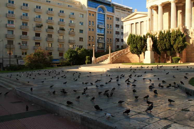 Если пройти от площади вон туда между домами - попадете как раз на площадь 'Неоклассической трилогии', где находятся знаменитые здания Национальной библиотеки Афин, Университет и Академия Афин.