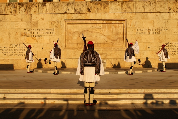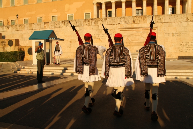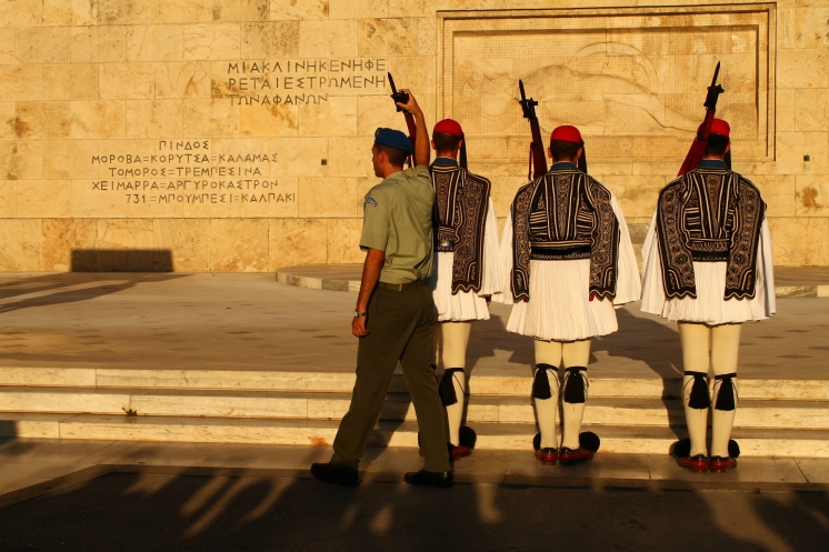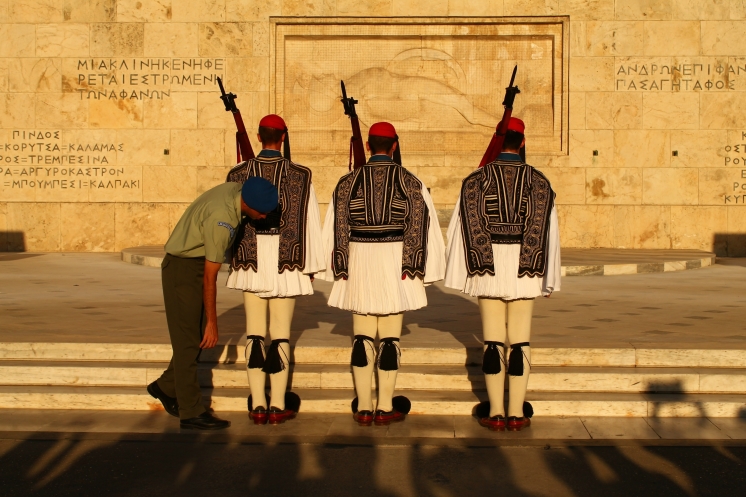 Когда я перед отпуском изучала маршруты по Афинам, меня приводил в некоторое замешательство совет: обязательно посмотреть смену караула эвзонов на площади Синтагма. Бог мой - думала я - ну что я, не видела смены караула? Слава богу, в Москве живем, и у нас тоже могила Неизвестного солдата есть, дочке маленькой сие действо не раз показывала...