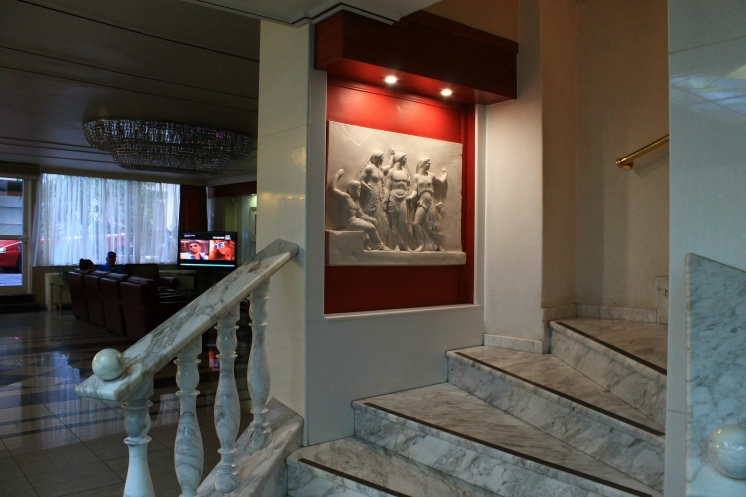Выбор мой оказался очень удачный! Просто "в десятку"! (выбирала отель, наверное, с месяц... параллельно изучив карту центра Афин и отзывы о многих других отелях) За 40 евро в сутки на двоих (очень приличный завтрак "шведский стол" включен) мы получили скромный, но очень чистенький номер, с хорошо работающим кондиционером (регулировался пультом) и балконом. Причем вид на боковую улочку, что означает относительную тишину ночью и утром.