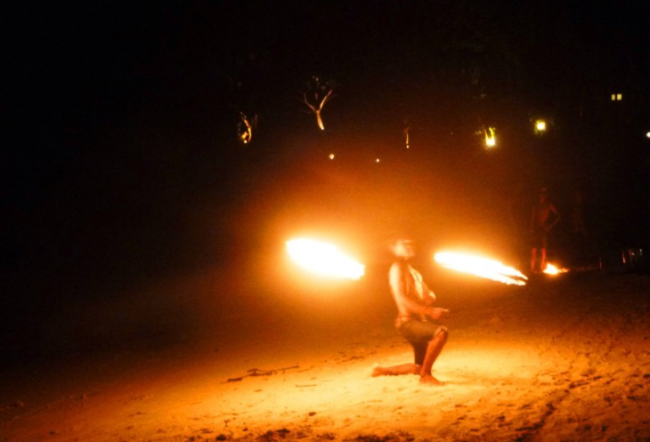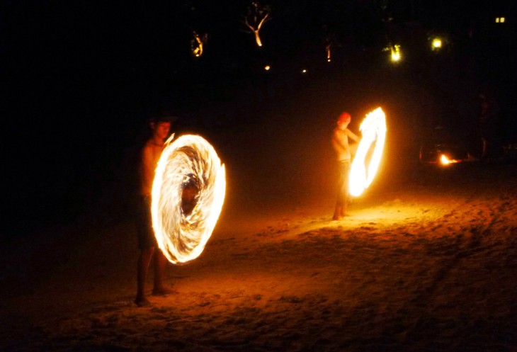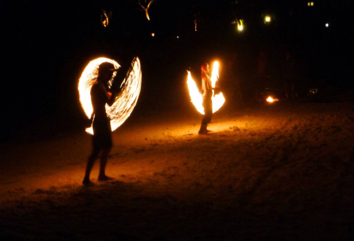 Перед наступлением сумерек работники отеля оперативно расставили столики и кресла на песке возле самой кромки воды и зажгли иллюминацию, свечи и факелы. Начиналось "Огненное шоу". Зрелище, конечно, было завораживающее. Невозможно было без восторга смотреть на то, что вытворяли молодые ребята, легко и весело жонглирующие пылающим реквизитом!