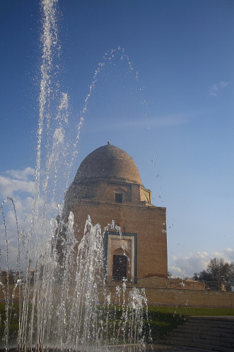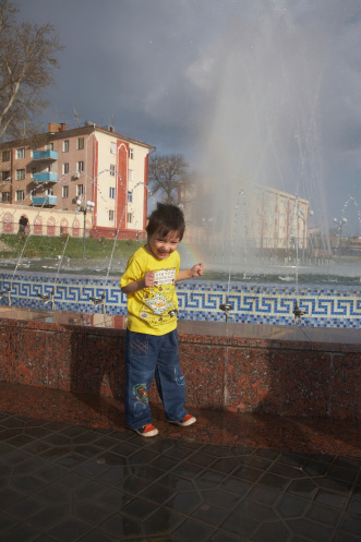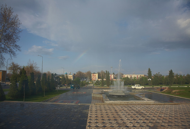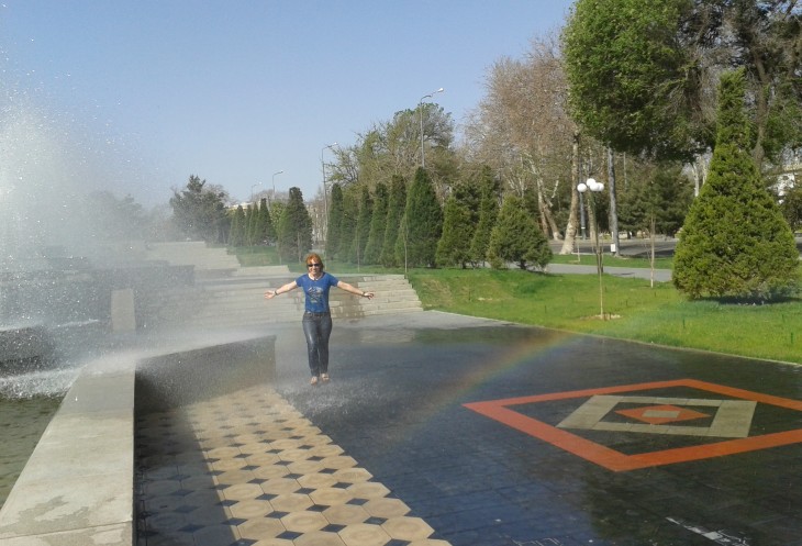 От жадности и нетерпения, я запланировала на Самарканд целых пять дней – этого с лихвой хватило на то, чтобы обойти все, что хотели увидеть, а многие места обойти по несколько раз, нагуляться и даже съездить в соседний Шахрисабз. Поэтому непогода первого дня никак не испортила наших планов – мы, не торопясь, посмотрели фонтаны и Гур-Эмир, мимо которого все равно было не пройти. Фонтанов в Самарканде много и они, в отличие от ташкентских, почти все работают. Некоторые фонтаны настроены так, что ветер сдувает струи и заливает все вокруг – дорожки, газоны, прохожих. А в одном фонтане – всегда плещется радуга.