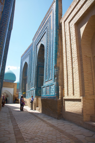 Следующее место, куда идут все туристы аллея мавзолеев - старое кладбище с оптимистичным названием Шохи-Зинда, что означает «живой царь». Первый мавзолей здесь принадлежал как раз этому живому царю, которого, вроде как никто не видел погибшим, и, возможно, он просто спрятался в колодце и сидит там уже больше тысячи лет, ждет чего-то. А был он каким-то родственником пророка, а значит, тоже святым. Сильные мира древнего считали, что мавзолей поближе к мощам святого даст им какие-то привилегии в мире ином, и, постепенно, выстроилась целая улица мавзолеев. Странная улица, на которой никто никогда не жил, зато строили на протяжении тысячелетия.