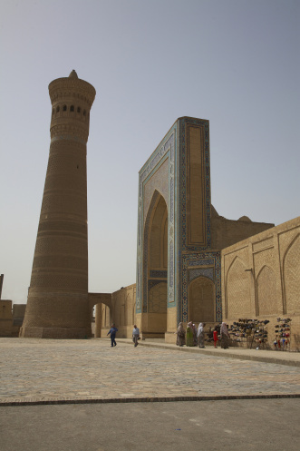 Визитная карточка Бухары – мечеть и минарет Калян. Первая мечеть на этом месте была построена еще в 8 веке, но потом она была разрушена и в 11 веке была отстроена заново. От мечети 11 века остался только минарет – сама мечеть была разрушена армией Чингизхана. Этот минарет сейчас мы и смотрим. А рядом уже в 16 веке построили мечеть. Разница в архитектуре, узорах и способах украшения сразу заметна. Мечеть с уже знакомыми голубыми цветами на портале, а минарет украшен рельефной вязью и только по верху идет полоса глазури.