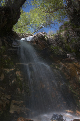 Знаем, что где-то там должен быть водопад. По хорошей тропе быстро до него доходим. Правда, чуть позже выяснилось, что это совсем не тот водопад. Зато этот красивый, а над ним стоят милые березки.