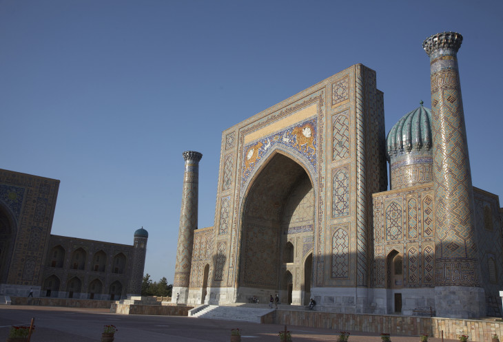 Второе здание, практически зеркально отражающее медресе Улугбека – медресе Шер-Дор, построенное в 17 веке. Название переводится как «здание со львами», хотя изображены на нем – тигры с солнцем на спине (в общем, такие динозавры). Вообще для мусульманской культуры не характерно изображение животных, вроде как Коран это запрещает, но, видимо, динозавров можно.
