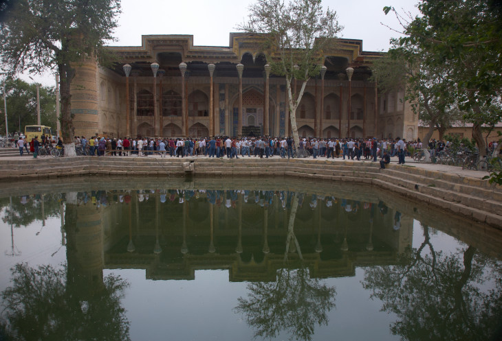 Почти сразу за крепостной стеной встречаем еще один хауз – пруд, то есть. А рядом с прудом действующая мечеть Боло-Хауз. Мы увидели ее как раз во время намаза (ну или какого-то другого массового ритуала) – огромная толпа сидела перед мечетью и слушала что-то. А туристы у них за спинами любовались отражением старой мечети в воде.