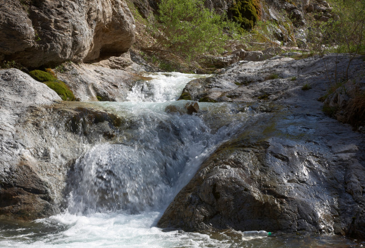 Правда, приток тоже течет в каньоне, видимо, тут так принято. Но на этот раз каньон не такой глубокий, а речка не такая бурная. Идем вниз – где-то по берегу, где-то прямо по воде, а где-то сползая пятой точкой по маленьким водопадам. Я мокрая по пояс. А дети сидят в рюкзаках и хохочут, да еще и нас подгоняют, чтобы мы не останавливались.