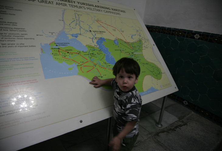 Если посетители, глядя на мавзолей недостаточно впечатлились величием Амира Тимура, то на входе можно посмотреть карту с его завоеваниями – от Индии до Стамбула.