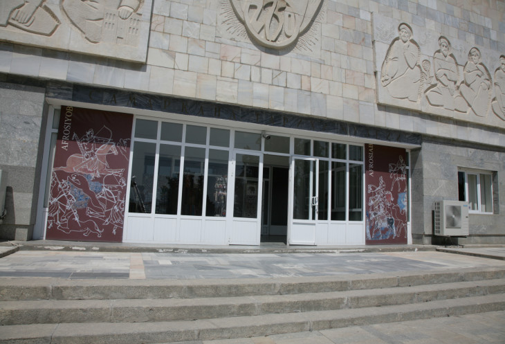 Рядом с местом раскопок – музей Афросиаба (мы сами в него не пошли, потому что дети были не в настроении). А на музее – образчик узбекской орфографии. Вообще, похоже, они еще не полностью перешли на написание латиницей, не все буквы адекватно заменены, да и вообще многие названия на разных указателях могут писаться по-разному. Вот вам пример – битва АфросиАба с АфросиЁбом. Понятно, что тут одна надпись по-английски, но это не единственный пример.