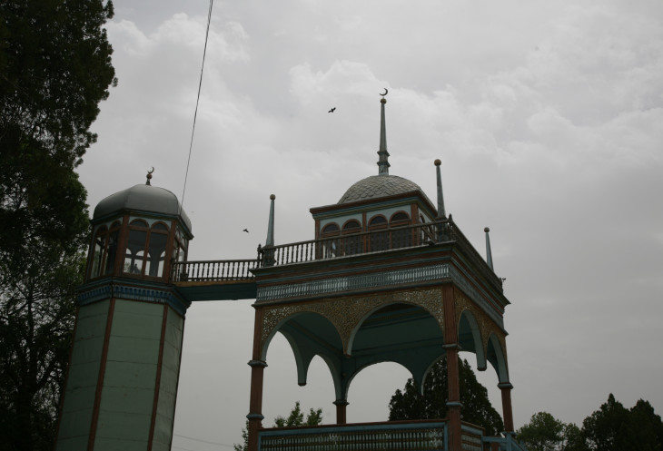 Когда мы уже устали от синего блеска и мозаичных цветов, перед нами открылась мечеть Хазрат-Хызр. Место во многих отношениях замечательное. Во-первых, мечеть сильно отличается по архитектуре от других достопримечательностей Самарканда – вместо сине-желтых кирпичей деревянные столбы и красно-розово-коричневые купола. А, во-вторых, Хызр тоже личность выдающаяся – мудрец, помощник и советчик, да еще и покровитель всех путешественников, который помогает тем, кто попал в беду. А еще, говорят, восточное гостеприимство возникло как раз благодаря Хызру – ведь он может прийти в любой дом в любом обличии, и лучше принять его порадушнее, может, и поможет чем-то.