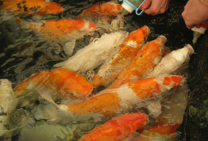 У самого входа в водопаде можно и самим покормить оранжевых карпов из бутылочки с соской, а также черепах в соседнем аквариуме. Обойдется такое удовольствие в 25 бат и вызовет море положительных эмоций.