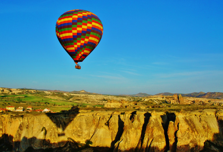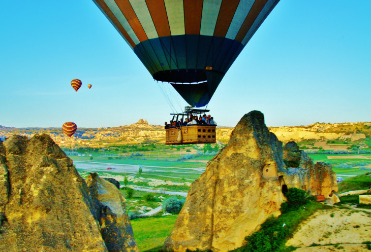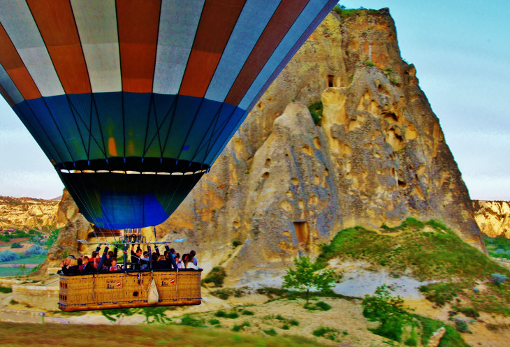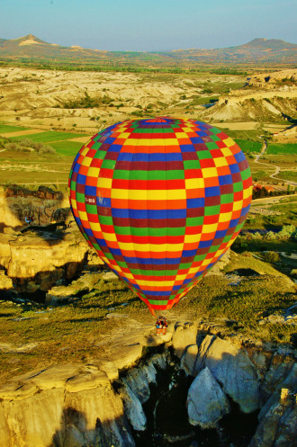 По словам хозяина нашего отеля, даже у одной компании цена может варьироваться от 100 до 180 евро. Нам он предложил «оптимальное» соотношение цены-качества за 140 евро, но в чем заключалась «оптимальность», мы так и не поняли. Вряд ли в комфорте: наша корзина была рассчитана на 20 тесно прижатых друг к другу пассажиров; трудно представить, что тех, кто заплатил по 100 евро, могут утрамбовать еще плотнее. И вряд ли в продолжительности полета: мы стартовали с той же площадки, что и остальные, и приземлились в ближайшее по ходу полета возможное для этого место. Полет продлился около 45 минут, при этом большей частью шар буквально «тащился» по земле и только при критическом приближении к очередной скале резко взмывал вверх, а затем вновь опускался так низко, что корзина цепляла траву. Так пилоты-виртуозы демонстрируют свое мастерство владения газовыми горелками. Это, конечно, не может оставить равнодушным, но я-то рассчитывала на фотографии с высоты птичьего полета!