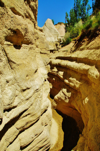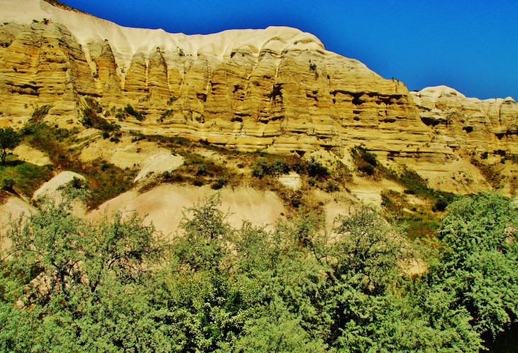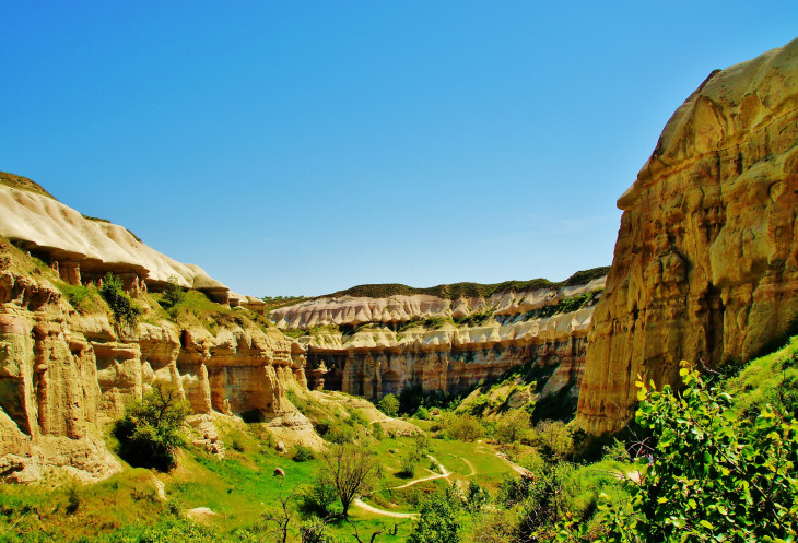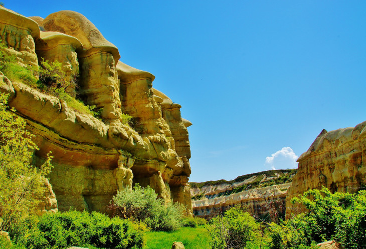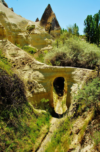 Увидев спуск в ущелье, мы сначала было хотели пройти мимо и прогуляться по его верху, но правильно решив, что другого спуска не будет, потопали вниз. Пейзаж, окружающий нас в ущелье Bağlıdere, не менялся на протяжении часа – полутора нашего движения: ярко-зеленые деревья и кустарники в коридоре из нависающих бело-желтых, как бы «ватных», скал. Дорога была легкой, приятной и не утомительной, но вдруг взяла и закончилась: местные садоводы-огородники разбили свое хозяйство прямо посреди ущелья. Мы уткнулись в изгородь, единственный способ обойти которую - протиснуться по узкому кривому каналу вместе с протекающим в нем ручейком.