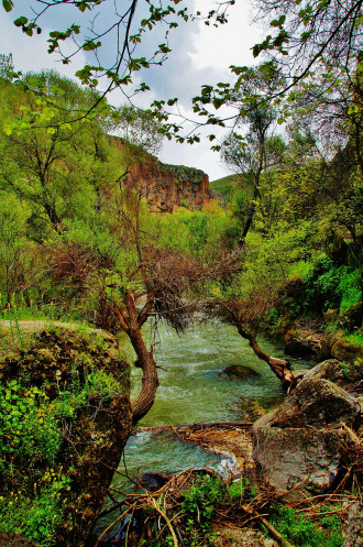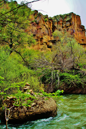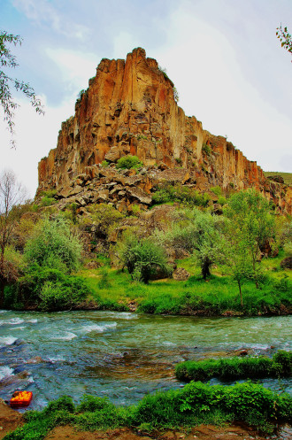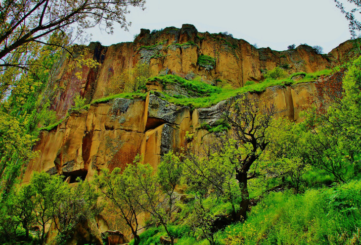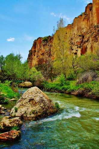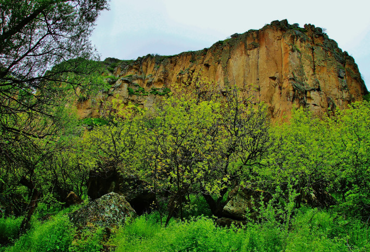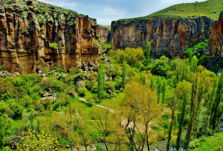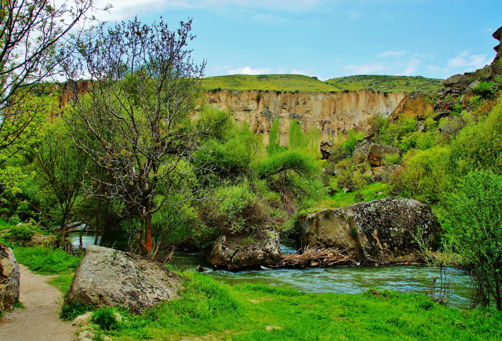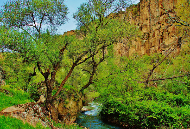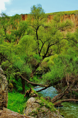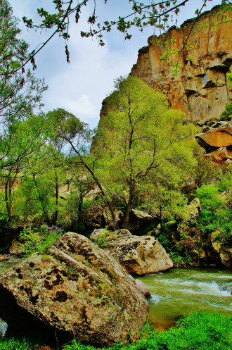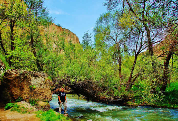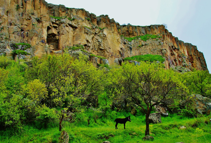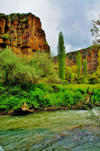 Далее в нашей программе была четырехкилометровая прогулка - «пробежка» по каньону Ихлара: гид, указав нам направление, рванул вперед, остальные устремились его догонять. Мы с супругом пошли в нормальном темпе, успевая любоваться окружающими пейзажами (отличными от увиденных ранее) и получать удовольствие от журчания реки Мелендиз, пения птиц и чистейшего воздуха. Жаль только, что солнце спряталось, и всю дорогу накрапывал дождик: фотографии получились неяркими. Как оказалось, торопиться было вовсе необязательно: добежав до «финиша», мы еще долго стояли без дела.