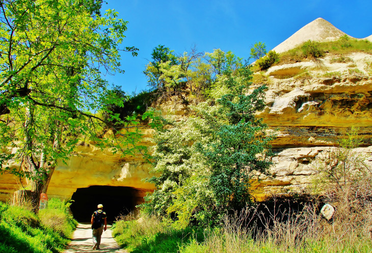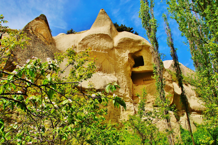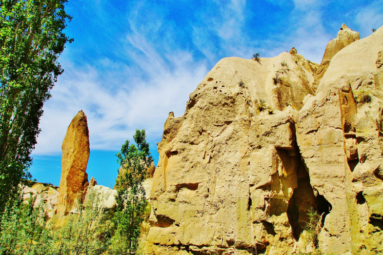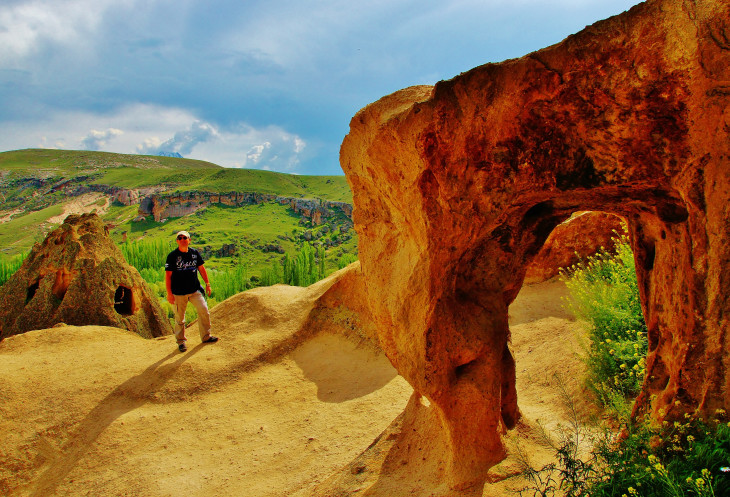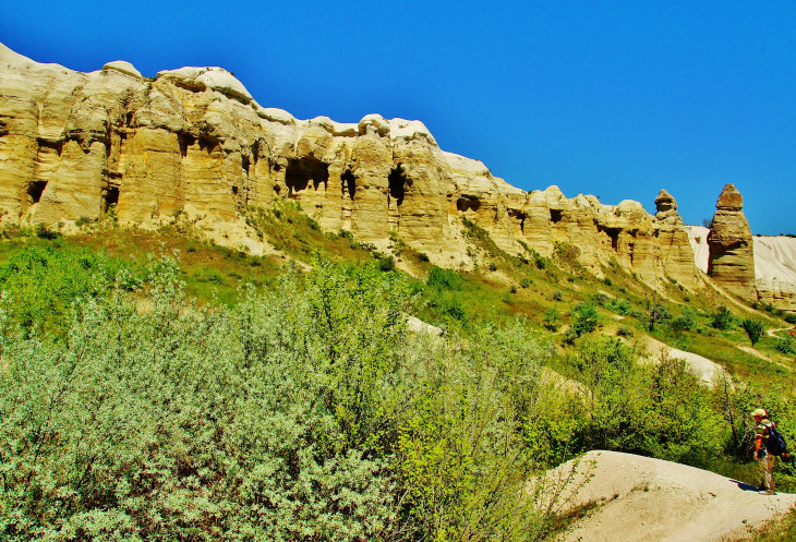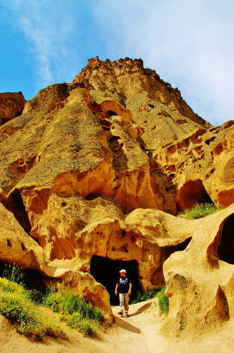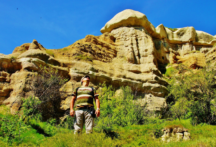 А дальше, как положено, увидели спуск в долину Meskendir и приготовились наслаждаться приятной прогулкой, как откуда не возьмись, посреди пустого поля появился местный житель. Забыла сказать, что мой муж сам неплохо говорит по-турецки, а вот понимает турецкую речь несколько хуже. А поскольку он человек крайне общительный, то тут же стал жертвой разговорчивого турка. Аллах его знает, зачем он сопровождал нас по ущелью не меньше километров пяти, терпеливо ждал, пока я сфотографирую заинтересовавшие меня виды, сокрушаясь, что на мне нет панамки (турецкое слово «шапка», в сочетании с сочувственным взглядом на мой сгоревший лоб, я слышала постоянно). В общем, расслабиться, посидеть на каком-нибудь пенечке и насладиться природой не получилось, кроме того, я уже начала было думать, что из-за него мы прозевали поворот к Красной долине. По ходу ущелья попадались разного вида пещерки, и я неоднократно предлагала мужу немного отстать от турка, спрятаться и переждать, пока тот уйдет! Наконец, он объявил, что дальше ему – прямо, нам – направо, пожал мужу руку, напомнил мне про шапку и удалился.