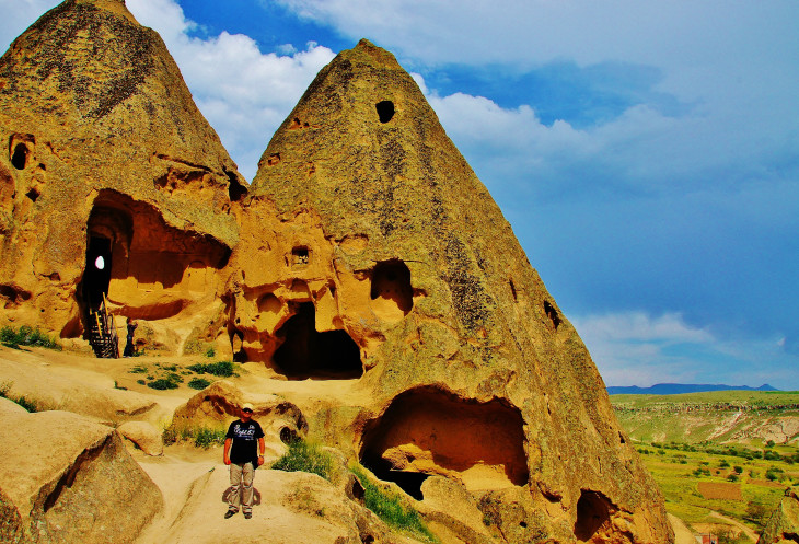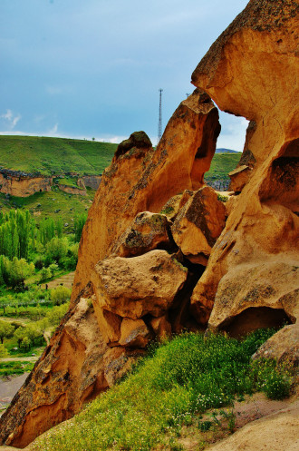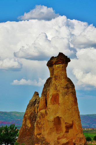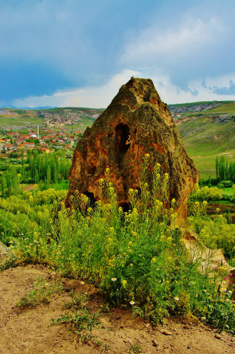 Последним пунктом программы должно было быть посещение деревни Çavuşin, меж тем погода вдвойне ухудшилась: небо почернело, ветер усилился. Поэтому когда наш микроавтобус промчался мимо поворота к «дырявой» Чавушинской скале, я не очень-то удивилась, но возмутилась. Толкнула мужа, он спросил по-турецки у экскурсовода, где обещанный Чавушин. Девочка начала извиняться: это, мол, водитель забыл, но по-моему, они просто договорились закончить экскурсию досрочно, тем более, в условиях надвигающейся грозы. Пришлось разворачиваться, но на скалу вместе с нами экскурсовод не полезла, а предложила сделать это самостоятельно за 20 минут. Мы выторговали пол часа и очень быстро поднялись почти на самый верх. Просто дух захватывает, когда стоишь на верху, под тобой бескрайние просторы, а над тобой черное небо со сверкающими молниями.