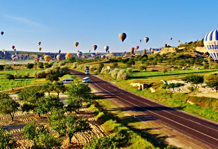 Автобус, что касается расстояний между сиденьями, не намного комфортней экскурсионного, в салоне было жарковато, поспать толком не получилось. Светать начало при подъезде к Аксараю и в окошке поплыли одна за другой красивые, как в рекламе, картинки: меж ярко-зеленых бархатных холмиков пасутся то лошадки, то коровки. Уже залитый солнцем Гёреме встретил нас множеством разноцветных воздушных шаров в почти безоблачном небе, и я окончательно забыла о бессонной ночи.