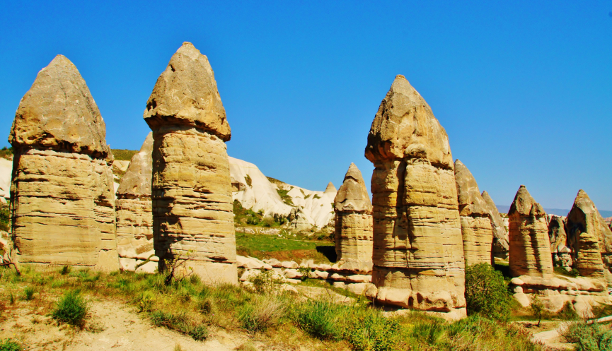 Неожиданно сплошная бело-желтая стена закончилась, и мы оказались на той самой волшебной поляне с гигантскими грибами. В тот момент я даже пожалела, что перед поездкой перерыла кучу информации с фотографиями, иначе впечатления были бы еще сильнее! Удивило, что в таком, казалось бы, известном и популярном месте, как Долина Любви, помимо нас никого не было. Однако для кого-то там была сооружена скромная чайхана, куда мы и направились передохнуть. Попив чайку, мой общительный супруг на целый час зацепился языком с хозяином, а мы с фотоаппаратом, не понимающие по-турецки, пошли общаться с молчаливыми исполинскими столбами.
