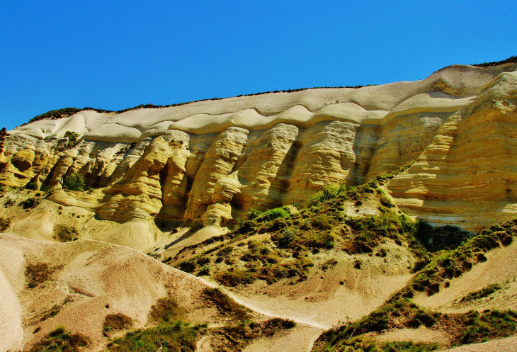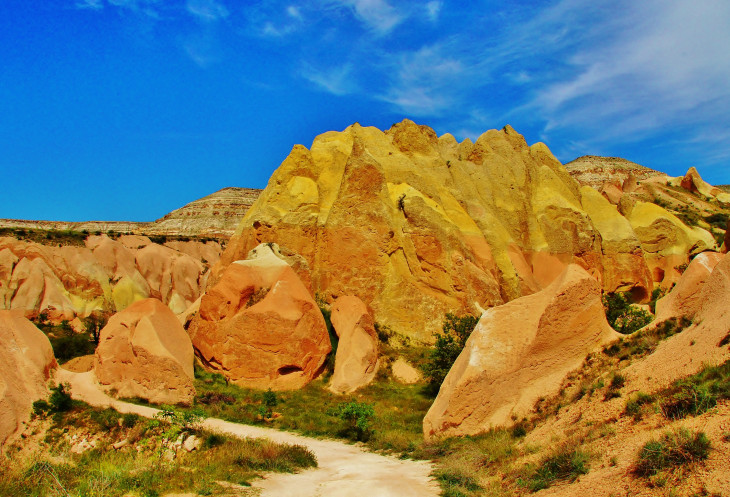 Далее дорожка «поскакала» вверх – вниз и вот таким манером мы добрались до развилки, откуда во всей своей красе пред нами предстали город и крепость Учхисар. Мы даже и не собирались туда идти, поскольку на завтра у нас был намечен многообещающий «Красный тур», якобы включающий посещение крепости, но об этом позже. А пока мы со спокойной душой перешли шоссе и направились в сторону Медовой долины Bağlıdere.