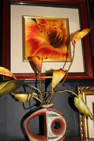 а возле панно и картин с розами, на столике в специальном горшочке стоят живые розы!