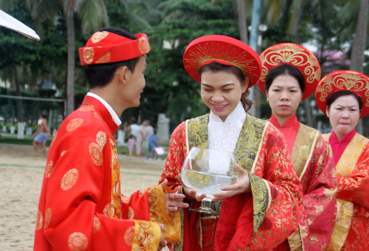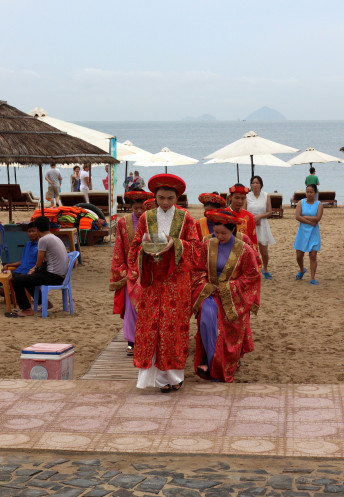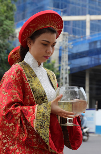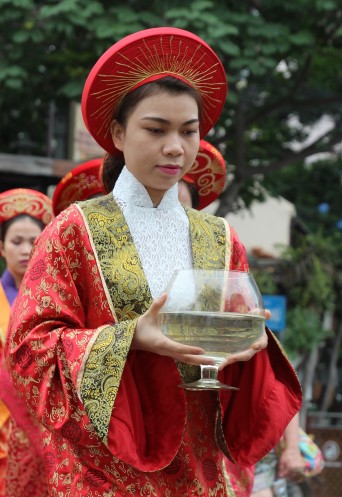 Впереди идет девушка, которая несет в руках большую стеклянную чашу с морской водой. Этой чести традиционно удостаивается лучшая вышивальщица.