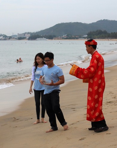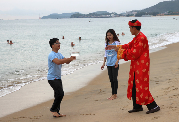 На берегу океана процессия останавливается и вперед выходит юноша, который принимает чашу у девушки,