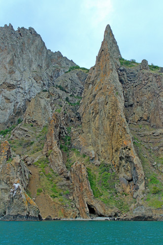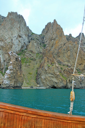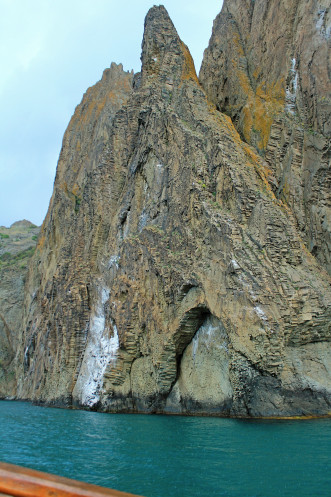 Отплывали мы с безоблачного Коктебеля и по мере приближения к Золотым воротам, усиливался дождь. Кара-Даг предстал перед нами во всей своей суровой красоте – остроконечные высокие скалы вулканического происхождения; прожилки из горного хрусталя; три сердоликовые бухты и множество пещер; ванна молодоженов; чайки и хохлатые бакланы, занесенные в Красную книгу и оставляющие белый помет на рифах. Сгустившиеся черные тучи лишь усиливали эффект грозности и могущества этого покоящегося зверя - Кара-Дага.