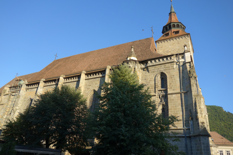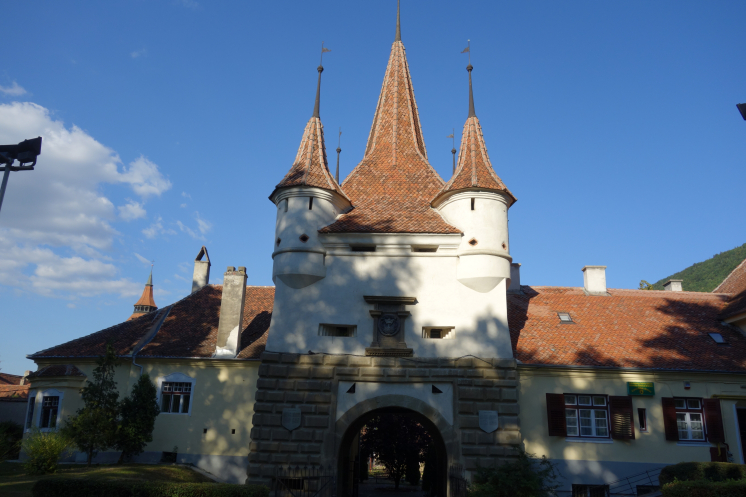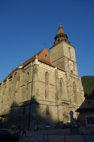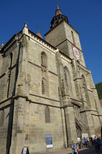 День завершился в Брашове. Этот город более известен нашим туристам, там рядом горнолыжный курорт Пояна Брашов, оттуда недалеко до замка Бран и дворца Пелеш. Тут я, наконец, узнала, где сделан снимок с обложки моего путеводителя: там за бравыми конными румынами в национальных костюмах виднеется надстройка над жилым домом Ратушной площади Брашова, которую сделали после отмены запрета строить православные церкви так, чтобы их было видно. А в саму церковь можно пройти через арку как раз в этом доме с надстройкой. Валентин показал нам собор св.Николая, Черную церковь, ворота Екатерины. Около этих ворот гуляла дама с собачкой интересной породы. Дама, видя постоянный интерес окружающих к своей собачке, научила ее команде, по которой собачка принимает позу для съемки.