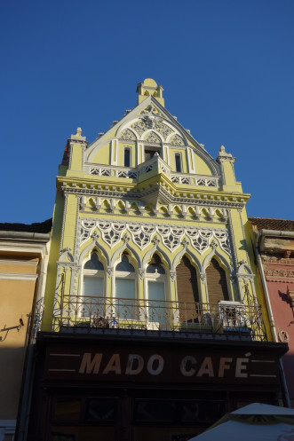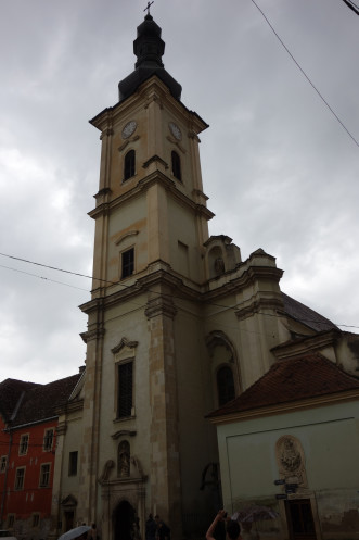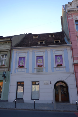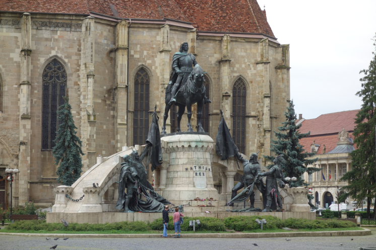 Начали осмотр Клужа мы с площади Аврама Янку: оперный театр, огромный собор, памятник Янку. Памятник было трудно хорошо снять — очень высокий и все против солнца получалось. А с другой стороны церкви — памятник румынским воинам, отдавшим жизнь за отечество. На этом месте раньше стоял памятник советским танкистам. Потом переехали к церкви св.Михаила — вот уж правда громадина! Рядом на площади затейливый конно-пеший памятник Матьяшу Корвину со скромной надписью «Король Матьяш». Времени на осмотр было немного: пробежались мимо дворца Банффи и «зеркальной улицы» до церкви францисканского монастыря, потом минут сорок на «свободное плавание». И тут я в ближайшем переулке и обнаружила дом, где родился Матьяш — почему-то до него нас Валентин не довел. Может, потому что у венгров и румын несколько разное отношение к венгерским королям.
