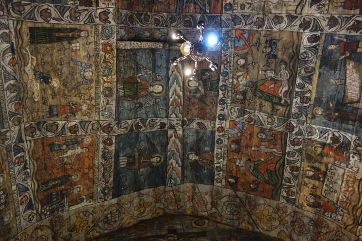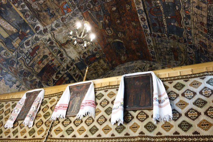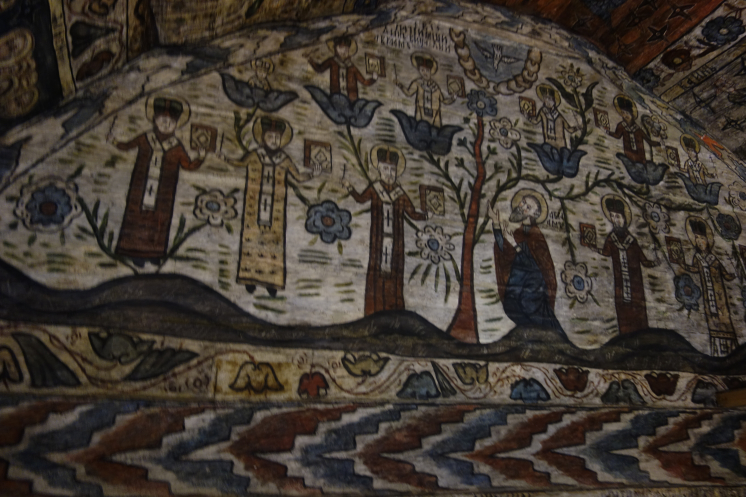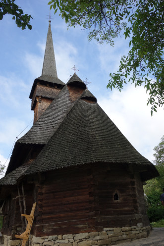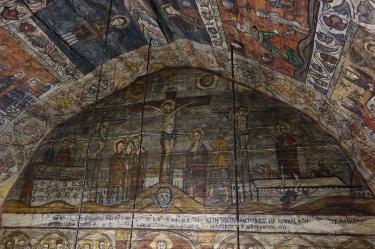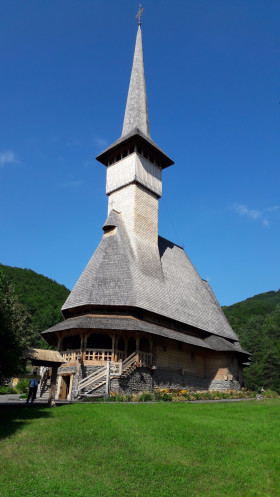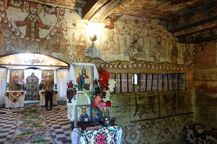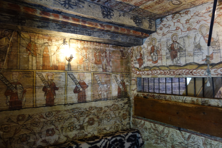 Ночевали мы в Бая Маре, немного прогулялись по историческому центру и поехали в деревушку Десешть, где находится маленькая деревянная церковь, находящаяся под охраной ЮНЕСКО. Место это не входит в стандартные туристические маршруты, я о нем до того даже не слышала. В деревне тишина, на кладбище копается пара мужиков, которые подсказали, кто может открыть церковь. Внешне она напомнила норвежские ставкирки , а внутри умиляет своей «домашностью» и наивными картинками росписей. Вход бесплатный, фото — пожалуйста, на хоры подняться — пожалуйста. Может, потому народ так охотно жертвовал «на церковь».