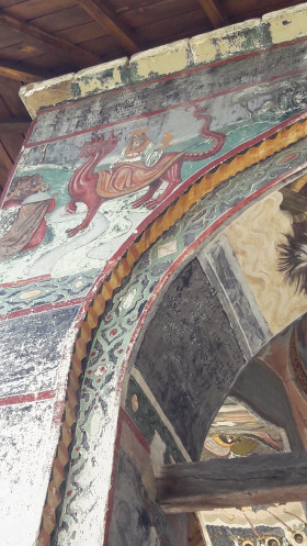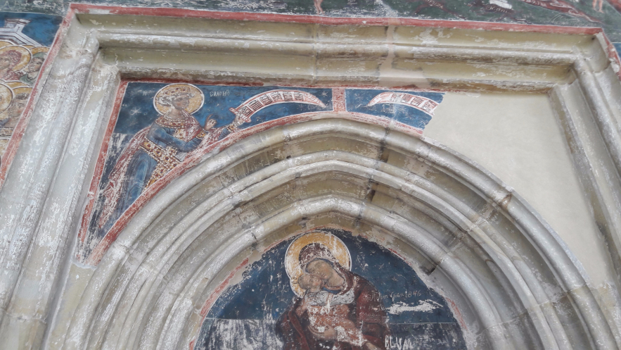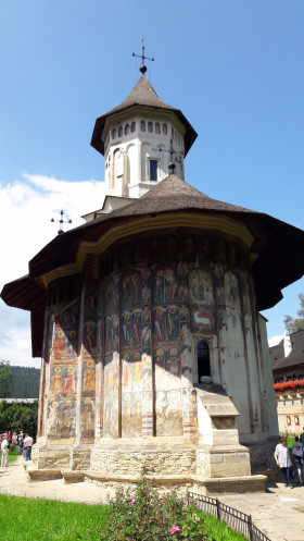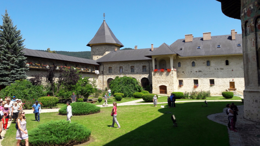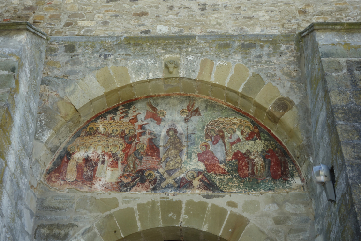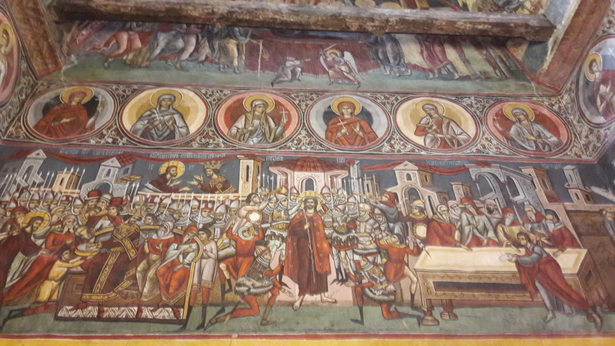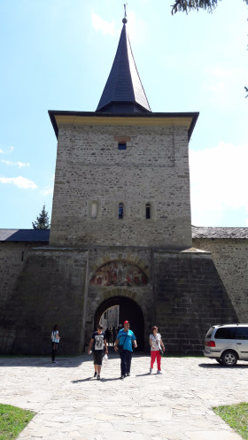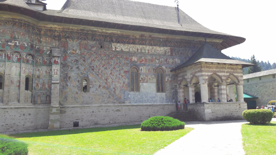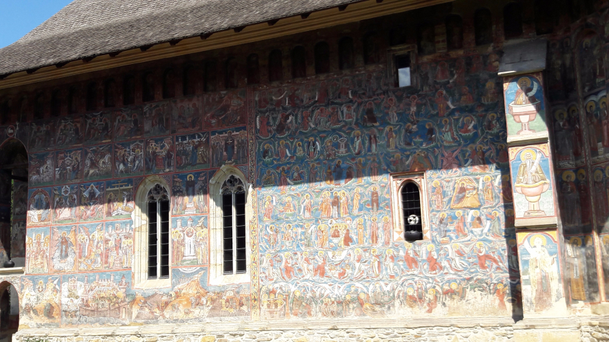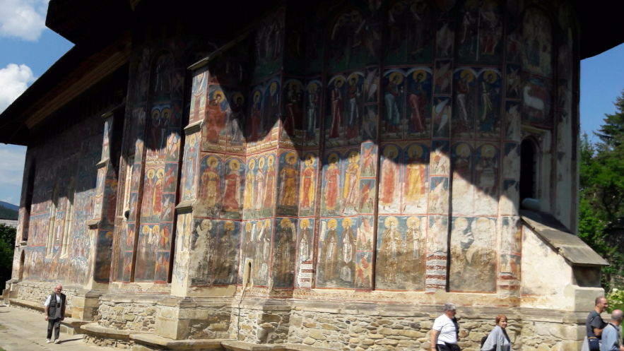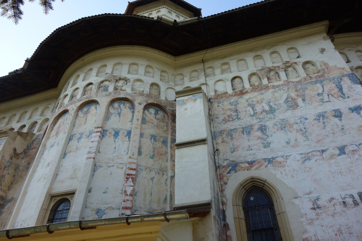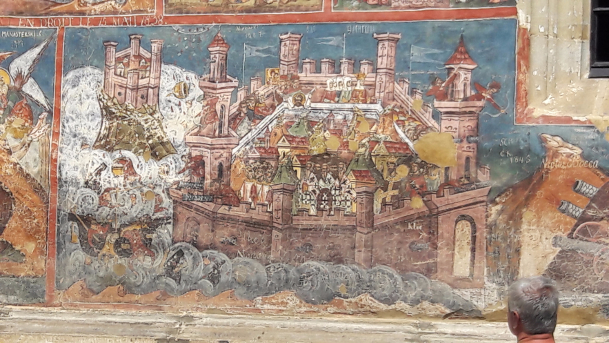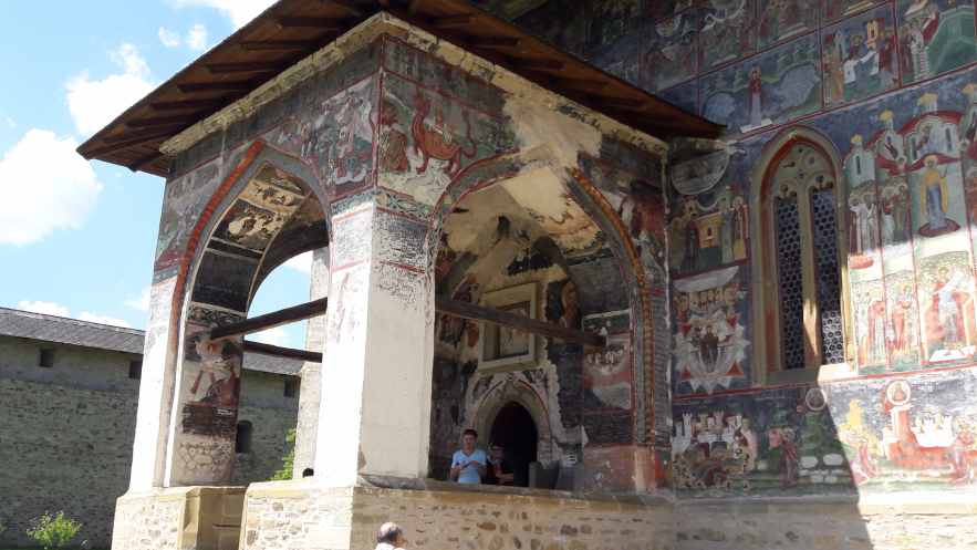 После беглого взгляда на Сучавскую крепость — бонус от Валентина: он завез нас в монастырь святого Иоанна Нового Сучавского, с которого, собственно, и началась традиция делать внешние фрески. Только тогда технология не была отлажена, рисунки сильно пострадали от времени.