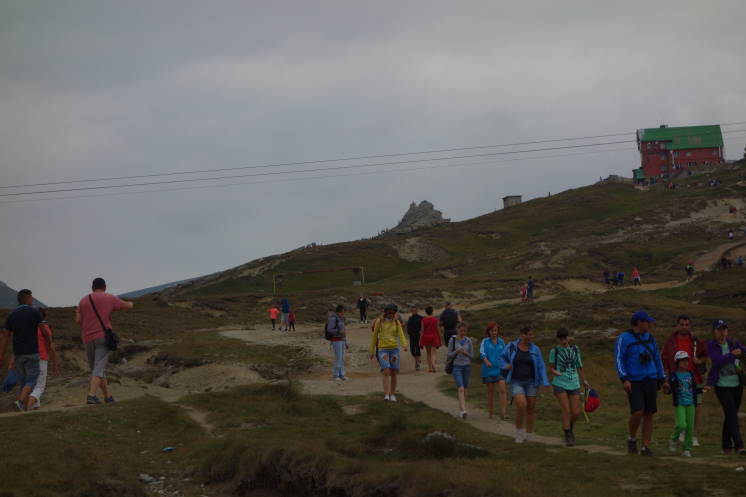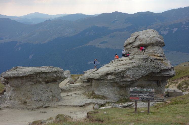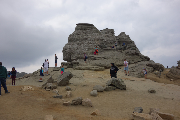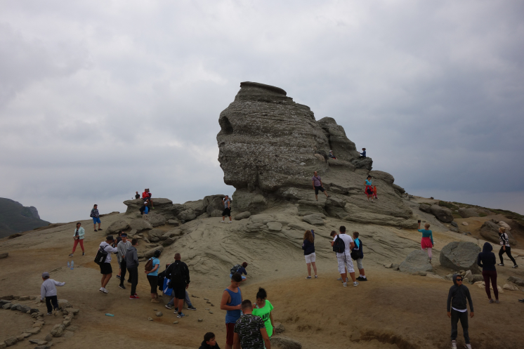 Экскурсия предлагалась как дополнительная, ее взяли все, кроме тех же туристов, что отказались идти в ущелье Келие Турзий. Только гид наш по незнанию обещал, что пешая часть будет недолгой: он последний раз там был 2 года назад, когда разрешали подвозить туристов на джипах практически до природных каменных скульптур. С тех пор правила изменились и нам пришлось долго подниматься в гору. Причем исходная точка подъема тоже находилась на изрядной высоте над уровнем моря, так что при ходьбе закладывало уши как в самолете. Одна из членов команды, 78 лет, до финиша не дошла и вернулась с полпути. Честно скажу, если бы мне пришлось тащить на себе рюкзак, я бы тоже не дошла или сильно отстала. Хорошо еще, что день был пасмурный — под палящим солнцем поход был бы еще труднее. Но тяжелый подъем того стоил — мы увидели румынского Сфинкса. Если камни Babele мне не напомнили Старушек, как я в них не вглядывалась, не узнать Сфинкса просто невозможно, особенно когда взглянешь ему «в лицо».