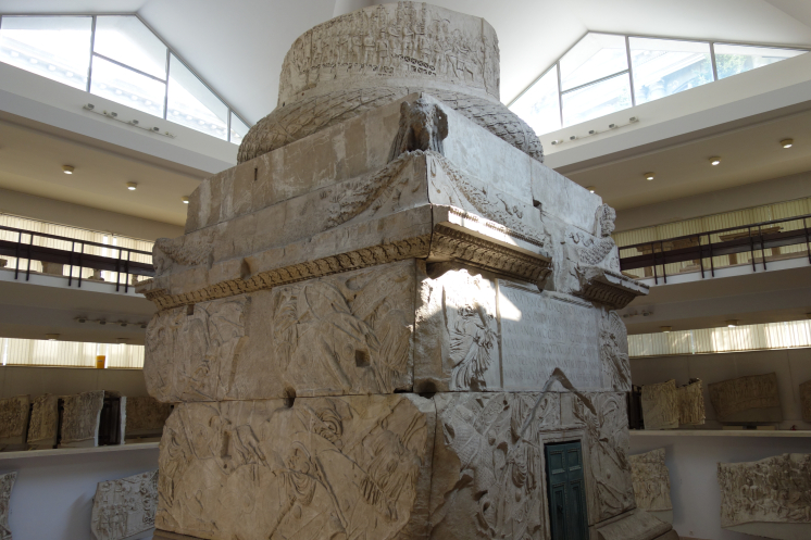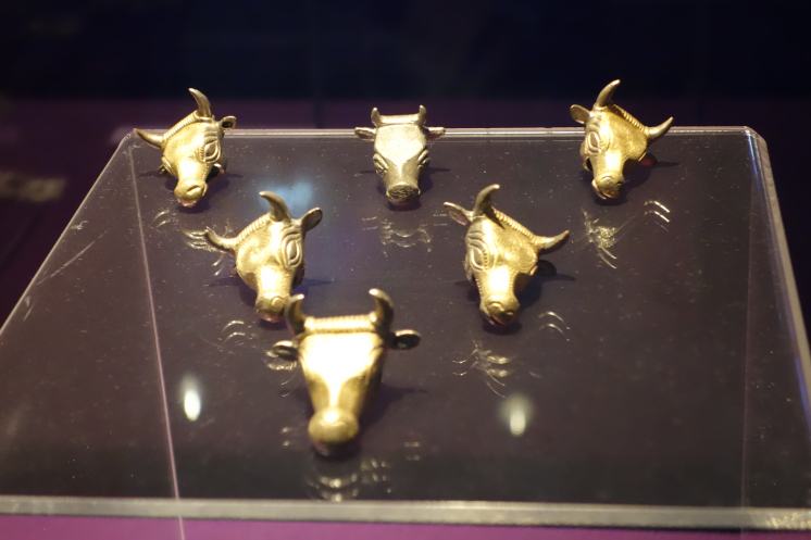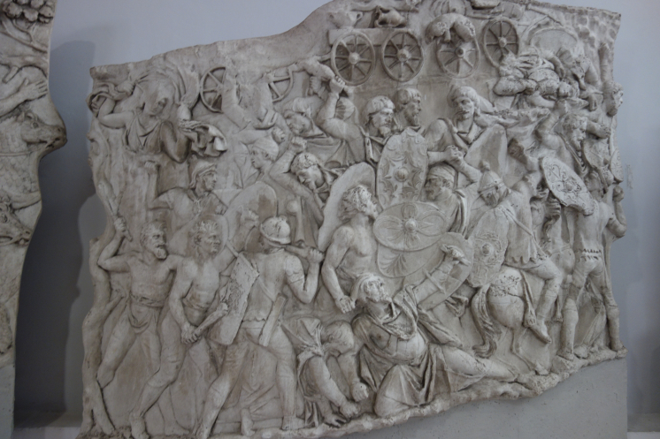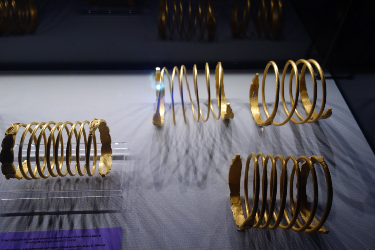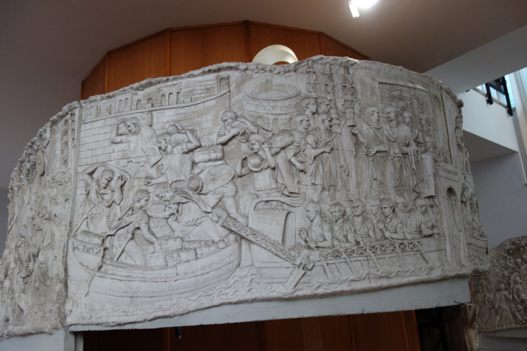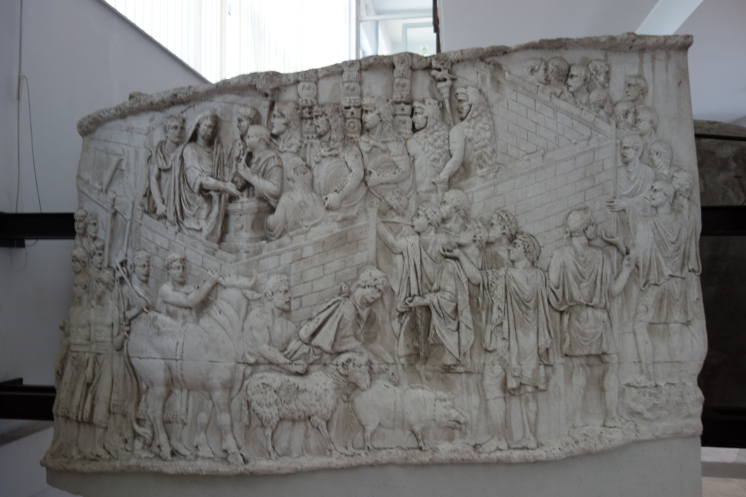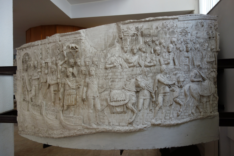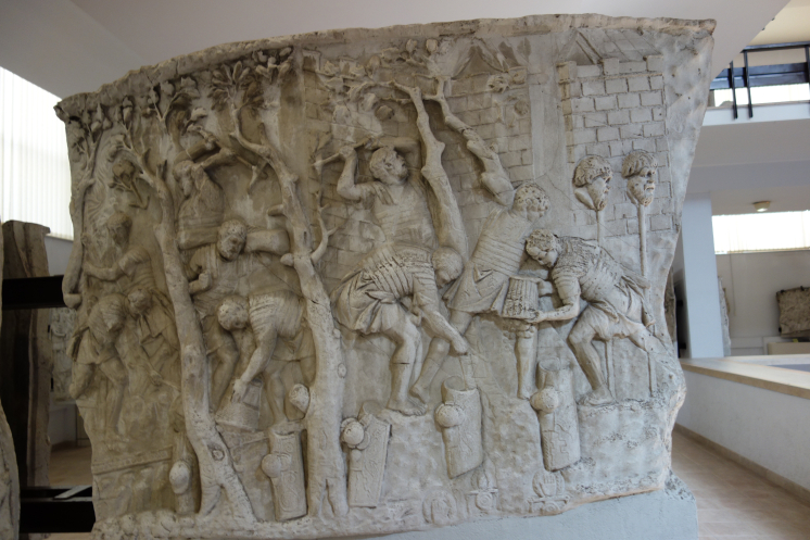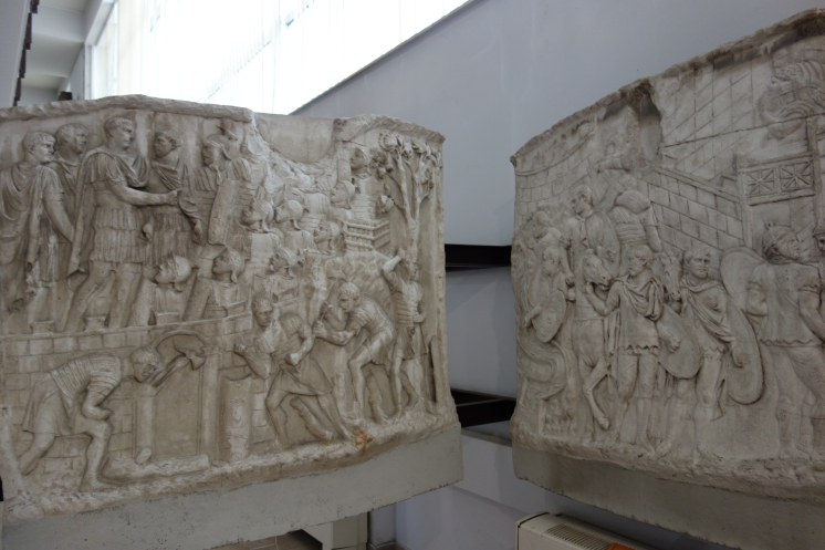 Начиналось и заканчивалось наше путешествие в Бухаресте, сразу из аэропорта мы поехали на обзорную экскурсию. Тут я сразу оценила нашего гида: он подарил всем по маленькой бутылочке питьевой воды, что было актуально в жаркий день. В прошлом году я не стала менять деньги в аэропорту, потому что там всегда очень невыгодный курс, а когда наконец добралась до Соваты (пробка у Синаи была бесконечная), оказалось, что обменники закрыты до понедельника (была суббота). Пришлось растягивать мою дежурную поллитровую бутылку воды (я всегда с собой в поездку беру воду и какой-нибудь бутерброд — мало ли как сложится, вдруг негде будет купить) на два дня: евро и банковские карты в курортных магазинах не принимали. Хорошо хоть в Данубиусах при полупансионе на ужин дают тоже поллитровую бутылку воды, а то бы из-под крана пришлось пить. На этот раз у меня были остатки денег с прошлого года, но жест гида я оценила. Потом во время экскурсии он подвел нас к обменнику с приличным курсом. Обогащенных местной валютой туристов он повел обедать в ресторанчик. Я не пошла, потому что недавно перекусывала в самолете, а вечером предстоял ужин с фольклорной программой. Предпочла сбегать в исторический музей, до которого по прямой от места окончания экскурсии было недалеко. В первую очередь хотелось посмотреть копию Траянской колонны, которая хранится в этом музее в виде отдельных блоков, так что можно рассмотреть все сцены подробно (жалко, времени было мало). Как-то я раньше не осознавала, что Траянская колонна в Риме установлена как раз в честь победы над даками, жившими на территории нынешней Румынии. Ну и золото даков хотелось посмотреть.