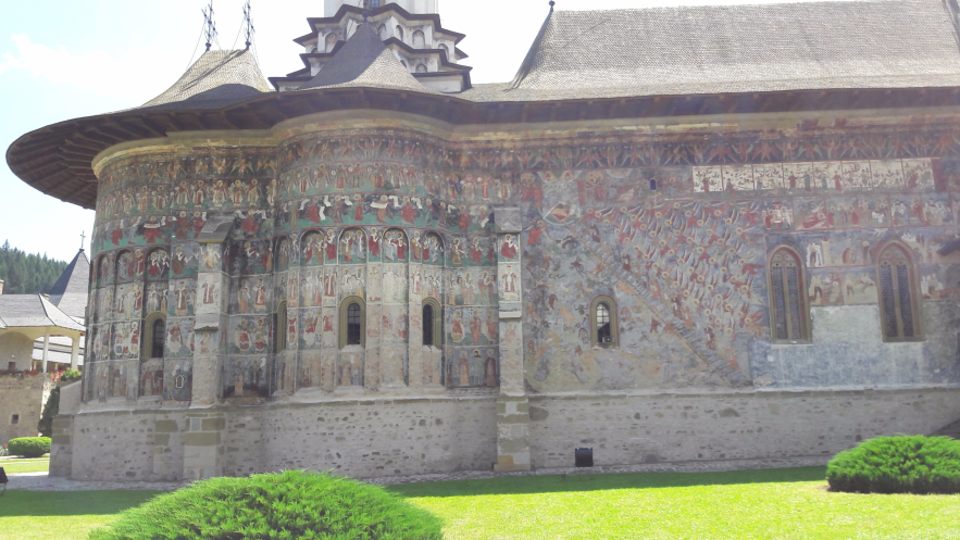 Совсем другое впечатление производят монастыри Молдовица и Сучевица, хотя там тоже толпы народа. Я давно туда хотела попасть, посмотреть неплохо сохранившиеся средневековые внешние росписи церквей. Нигде больше не встречала фрески на внешних стенах церквей, а в Румынии это распространено до сих пор. Вот тут действовало забавное правило: съемка фотоаппаратом платная, а на телефон — нет.