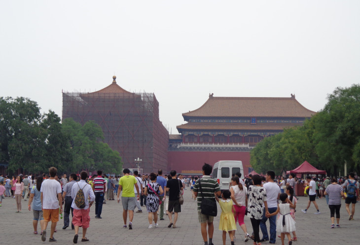 Следующим пунктом назначения был Запретный город Гугун. Там снова пришлось ждать. Лиза пошла за билетами, а мы бродили по площади перед входом туда сюда, глазели по сторонам и фотографировались. Площадь там большая, с кучей народа, и в какой-то момент оказалось, что договариваясь о месте встрече мы не так друг друга поняли. Еще какое-то время искали гида, а она нас. К тому моменту мы уже были с китайской симкой для звонков и интернета, но что-то позвонить не удавалось. Закончилось все благополучно и в город мы наконец попали.